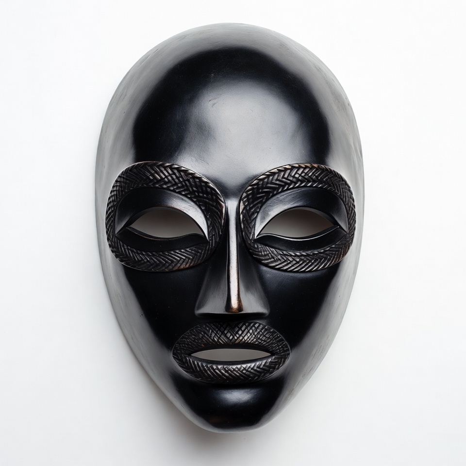 A black mask lies flat on a white surface. The mask has carved features and displays a unique design. It is part of cultural art.