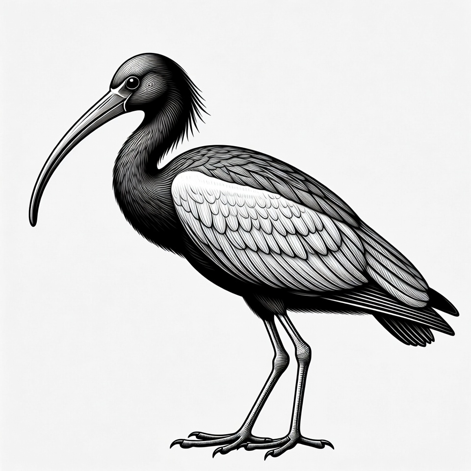 A bird with a long beak and white wings stands on its legs, looking to the side in a simple display. It has a detailed design in black and white.