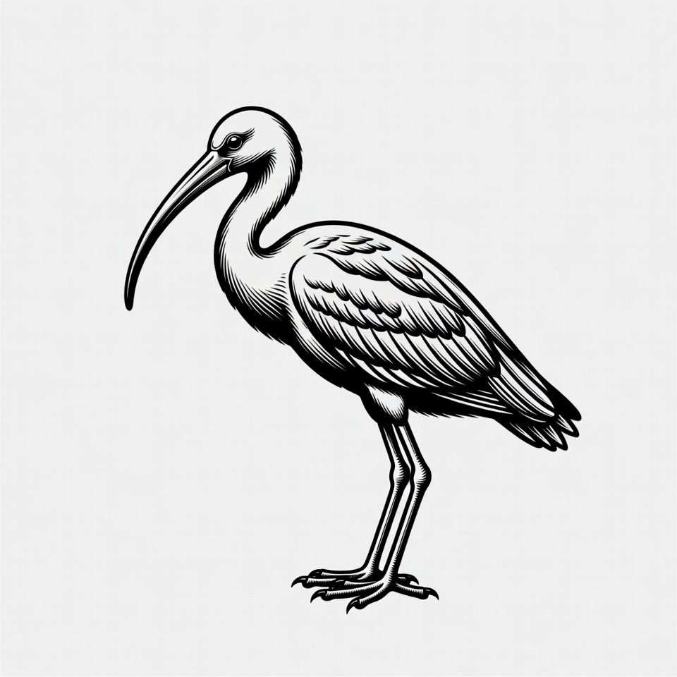 A bird with long legs and a long beak stands on one leg. Its feathers have detailed lines and patterns.