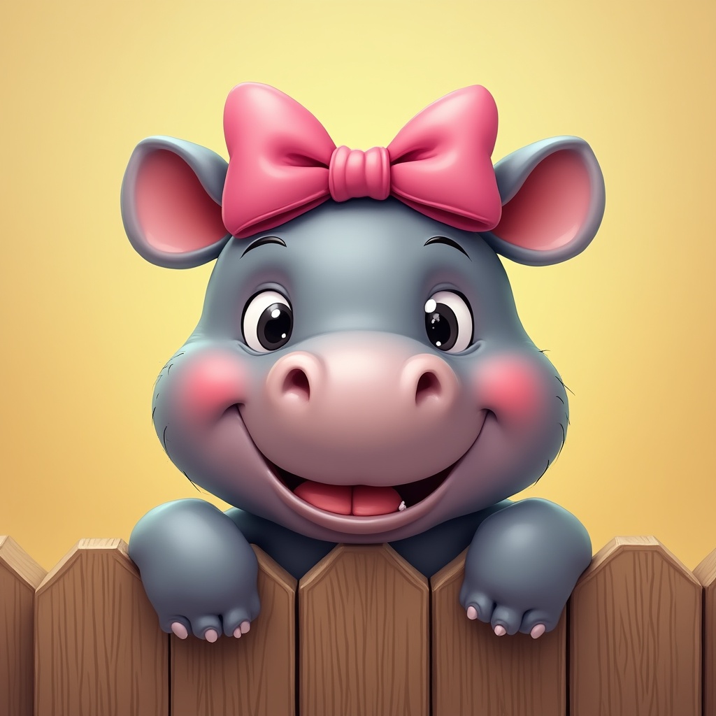 A cheerful hippo with a pink bow peeks over a wooden fence. The background is yellow and bright. The hippo has a big smile.
