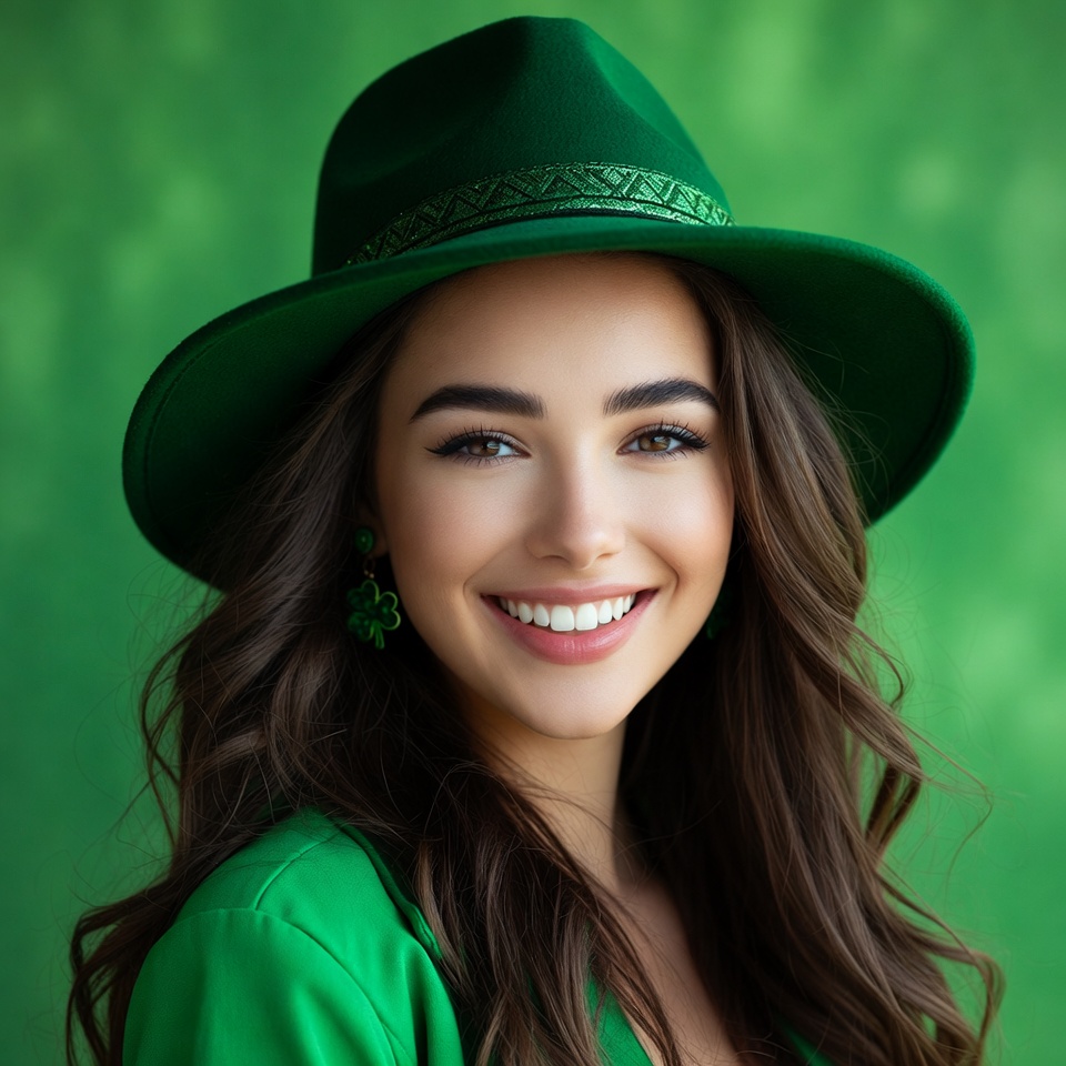 Woman smiles while wearing a green hat and outfit with earrings. Background features a bright green color. Celebratory mood is present.