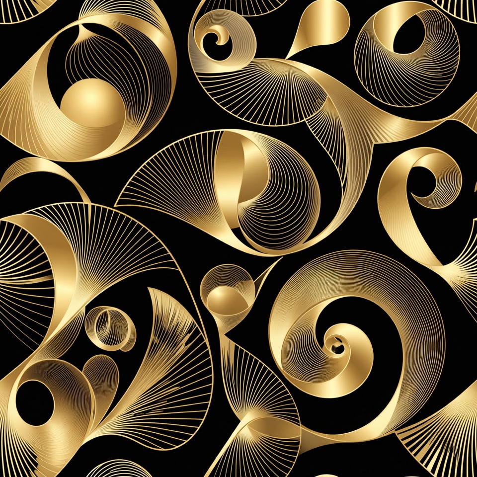 Swirls and curves made of gold lines create a unique pattern on a solid black background. Design showcases intricate details and shapes.