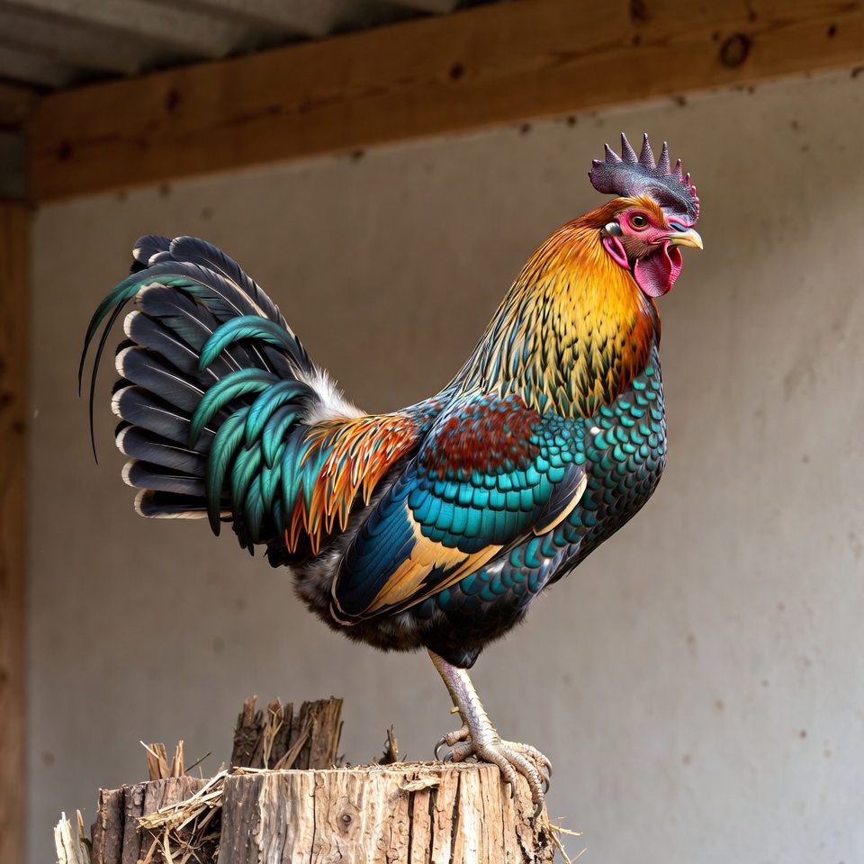 Rooster with bright feathers stands on a log inside a barn. The setting has wooden beams and a simple background.