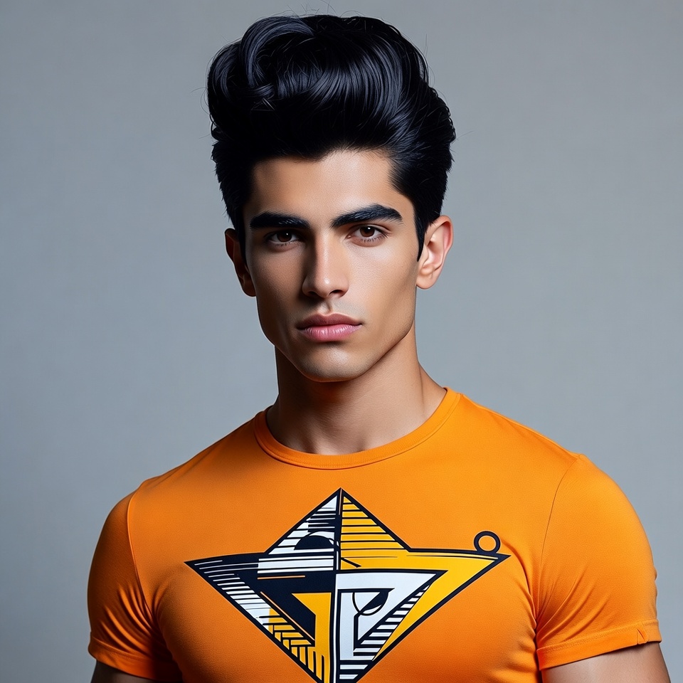 A young man stands confidently with styled hair while wearing an orange shirt featuring a design. He gazes directly at the viewer.