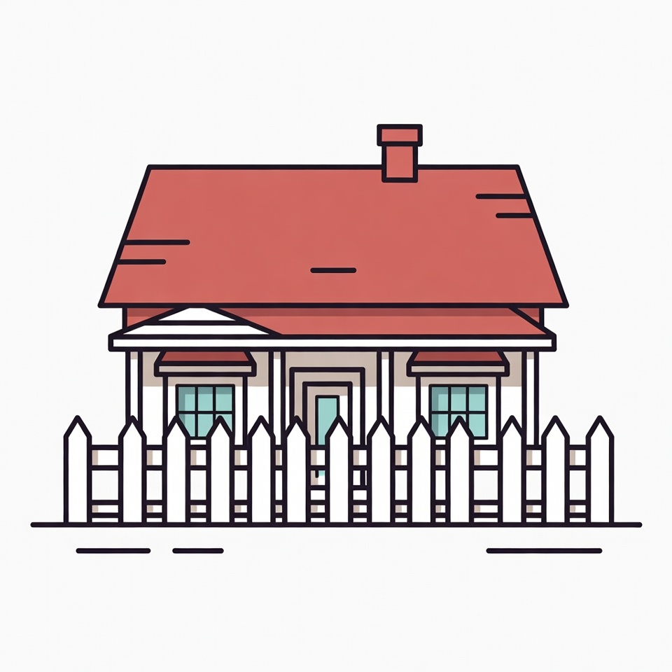 A house with a red roof, blue windows, and a white fence in front stands on a plain background. The scene shows a simple and clean style.