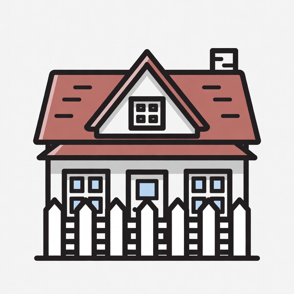 A drawing shows a house with a red roof and window. A white fence surrounds the house, indicating a home setting.