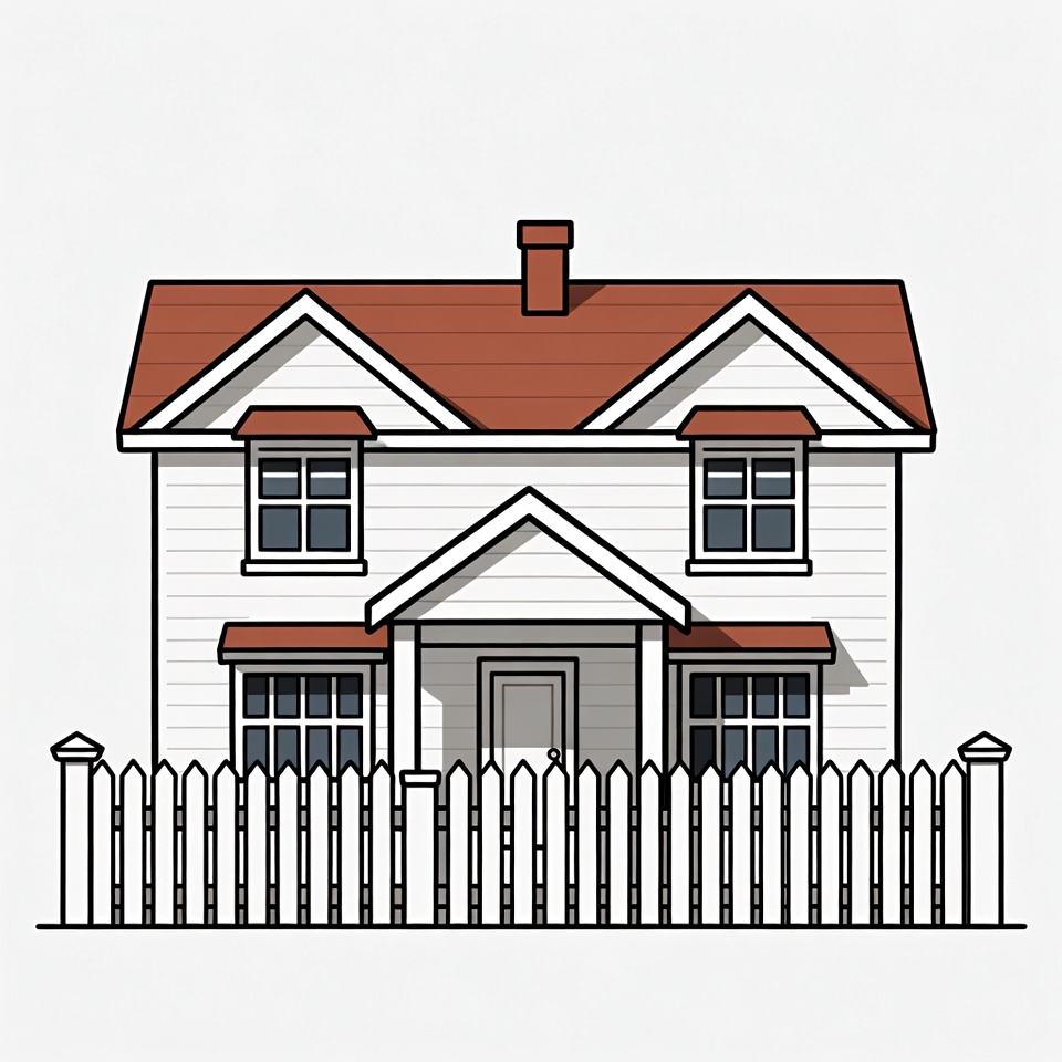 A house with a fence is shown in a simple style. The house features a red roof and white walls. Windows are placed on either side.