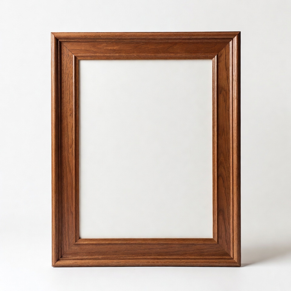 A wooden frame stands empty on a table. It showcases a simple design without any picture inside. The clear background highlights its shape.