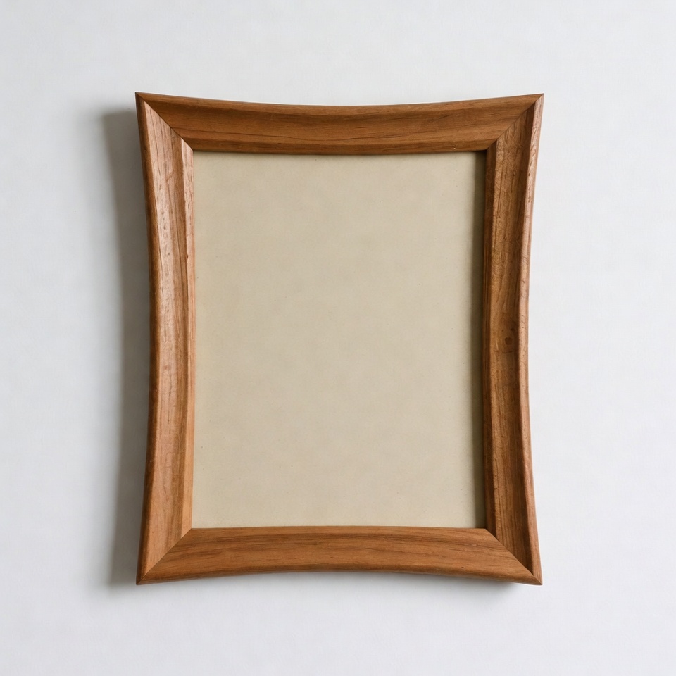 A wooden frame with a smooth surface hangs on a plain white wall. The frame is empty and shows no picture inside.