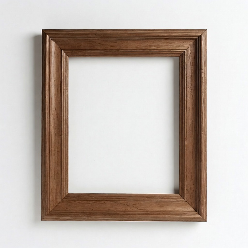 A wooden frame stands upright on a white wall. It has no picture inside and is ready for artwork to be added.