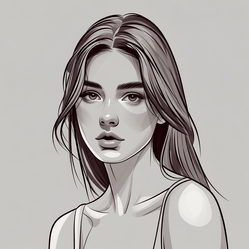 art, beauty, design, drawing, elegance, expression, face, features, gaze, hair, illustration, lines, lips, long hair, looking, portrait, shading, simple, style, woman