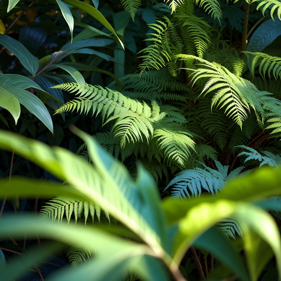 Green plants fill the frame in a garden. Fern leaves create texture against surrounding foliage. Sunlight filters through, highlighting details.