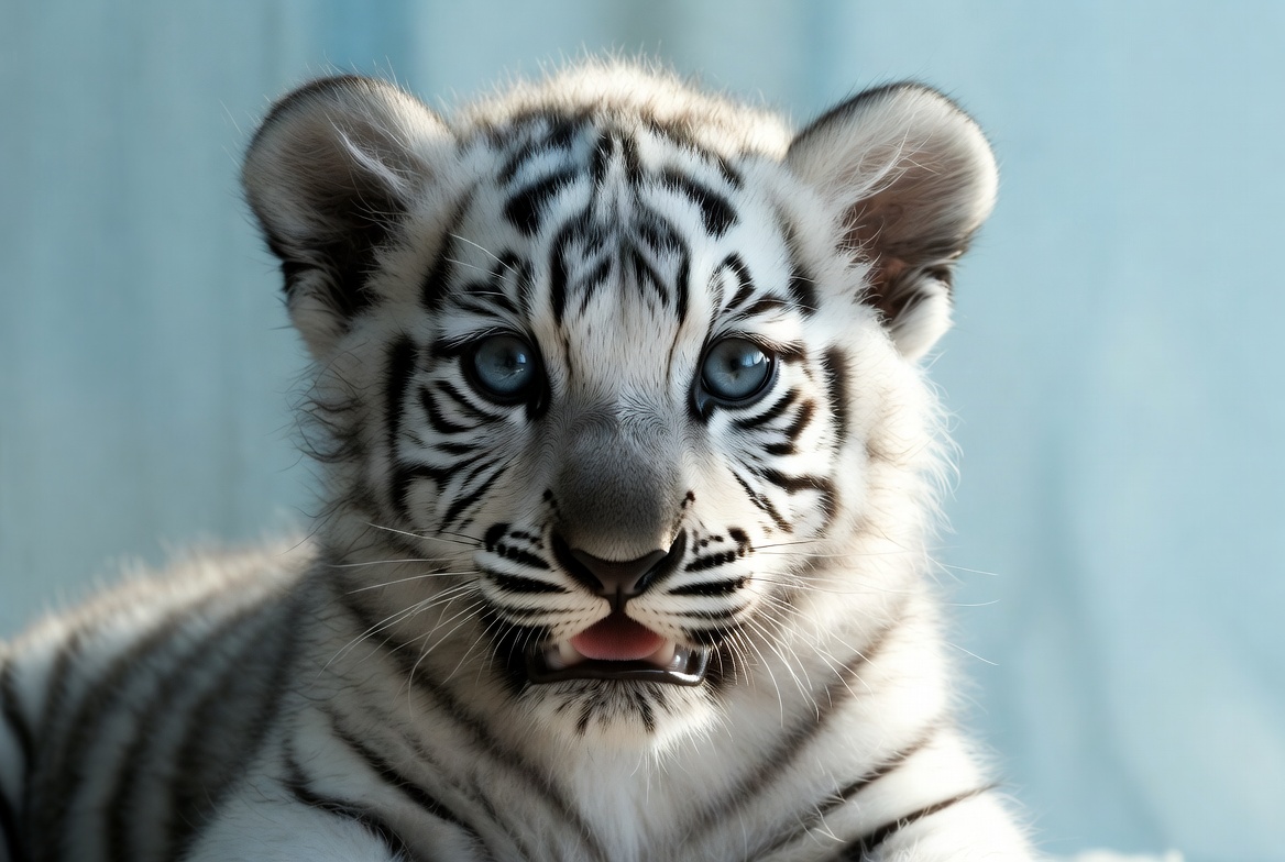 A young white tiger cub sits against a light backdrop. Its bright blue eyes look directly at the viewer. The cub has soft fur and small features.