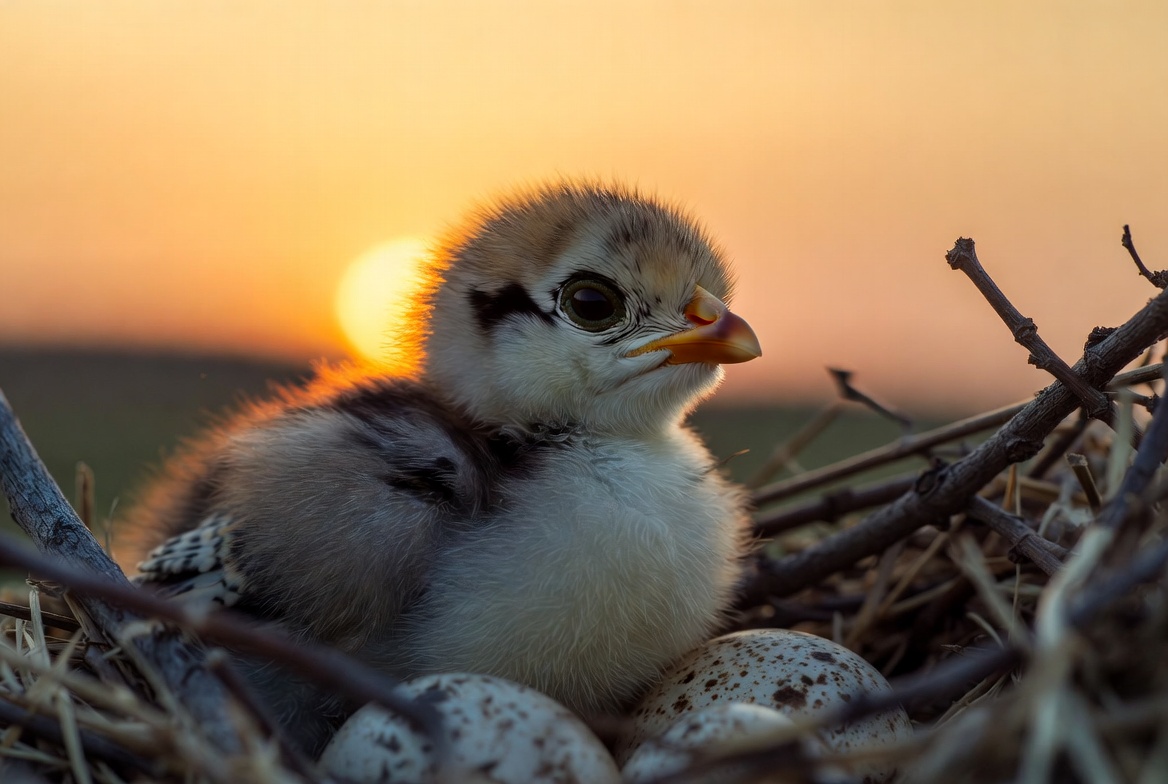 A chick is resting in a nest as the sun sets in the background. The scene shows the beginning of a new life in nature.