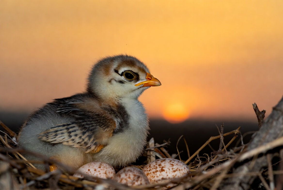 A chick sits in its nest with eggs, as the sun sets in the background, creating a warm light around the scene during the evening.
