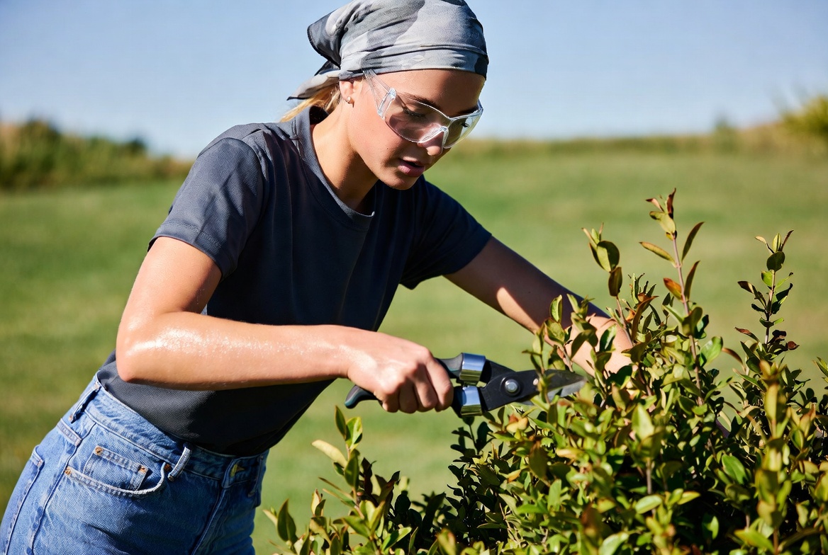 A person trims bushes using pruning shears in a garden during daylight. The scene shows green grass and clear skies in the background.