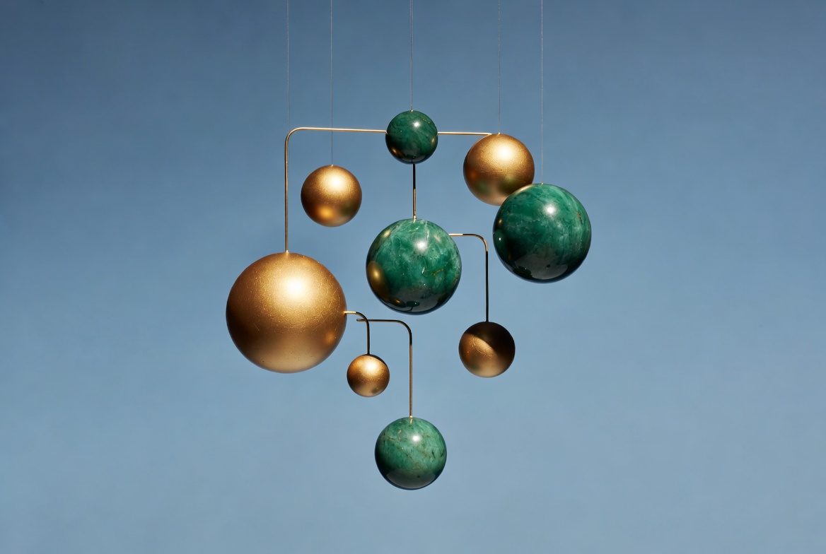 A mobile sculpture with green and gold spheres hangs in clear blue sky. The design showcases balance and movement in art.