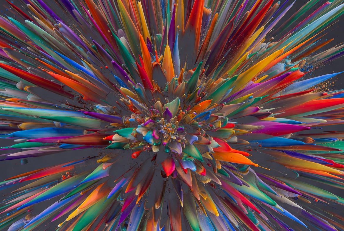 Bright and vivid spikes emerge from a central point, creating an explosion of color. The shapes and patterns are dynamic and engaging to observe.