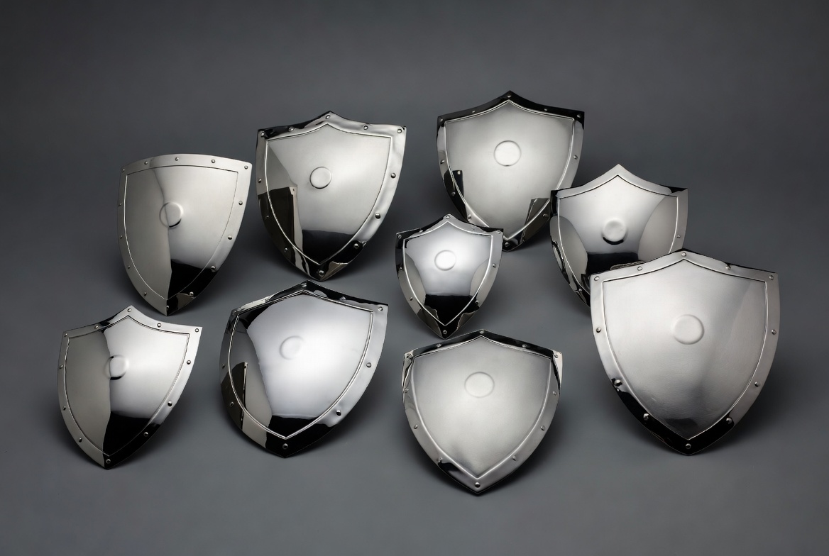 Several metal shields are arranged on a dark surface with different sizes and shapes. The shiny surface reflects light.