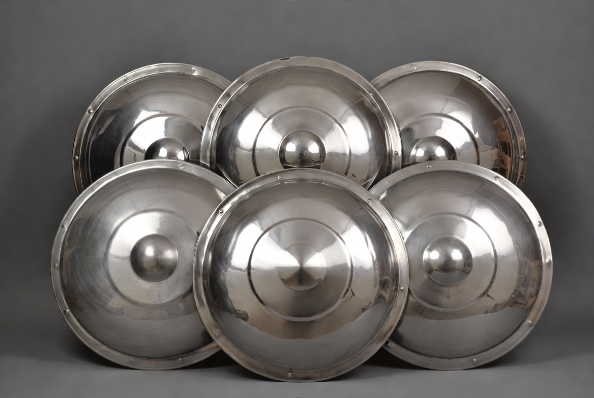 Six circular metal shields are arranged in a flat layout. They reflect light and show a smooth surface.