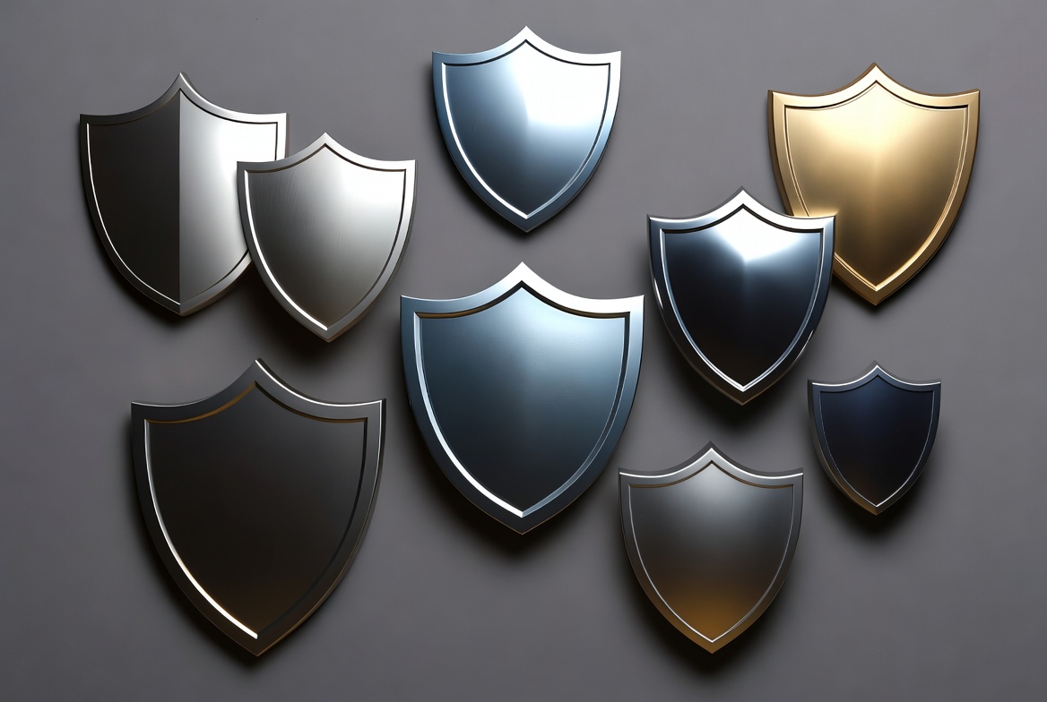 Various shields in different shapes and colors are arranged on a gray surface. The shields show metallic finishes and diverse patterns.