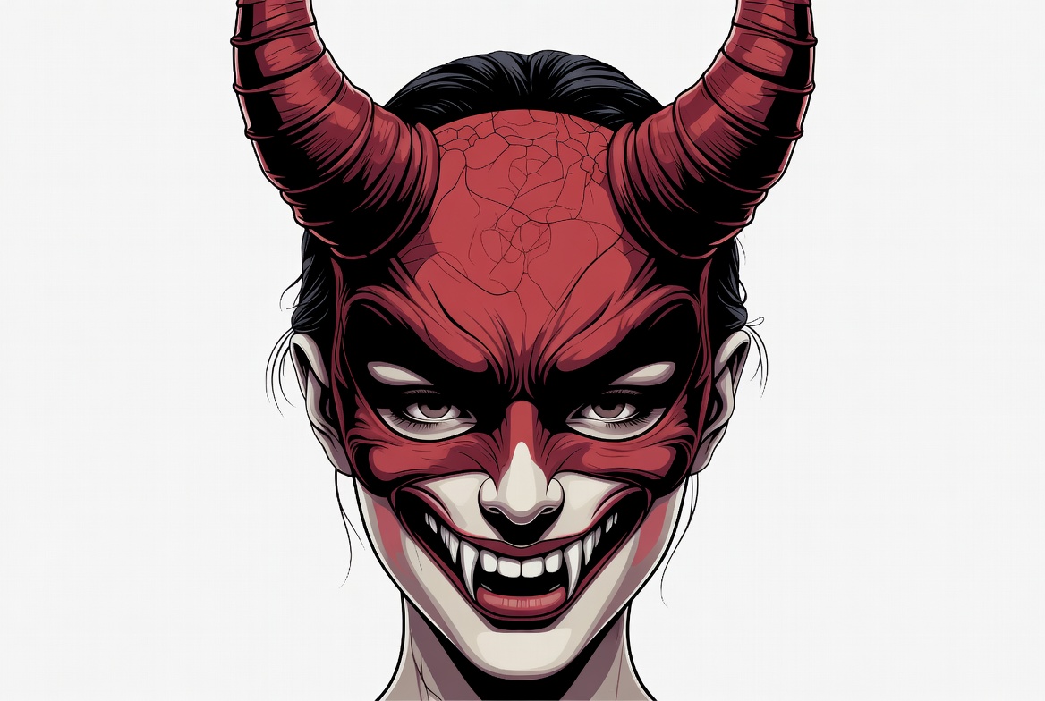 art, character, costume, creativity, dark, design, detailed, drawing, emotion, expression, face, fantasy, features, figure, horns, illustration, intense, mask, red, spooky