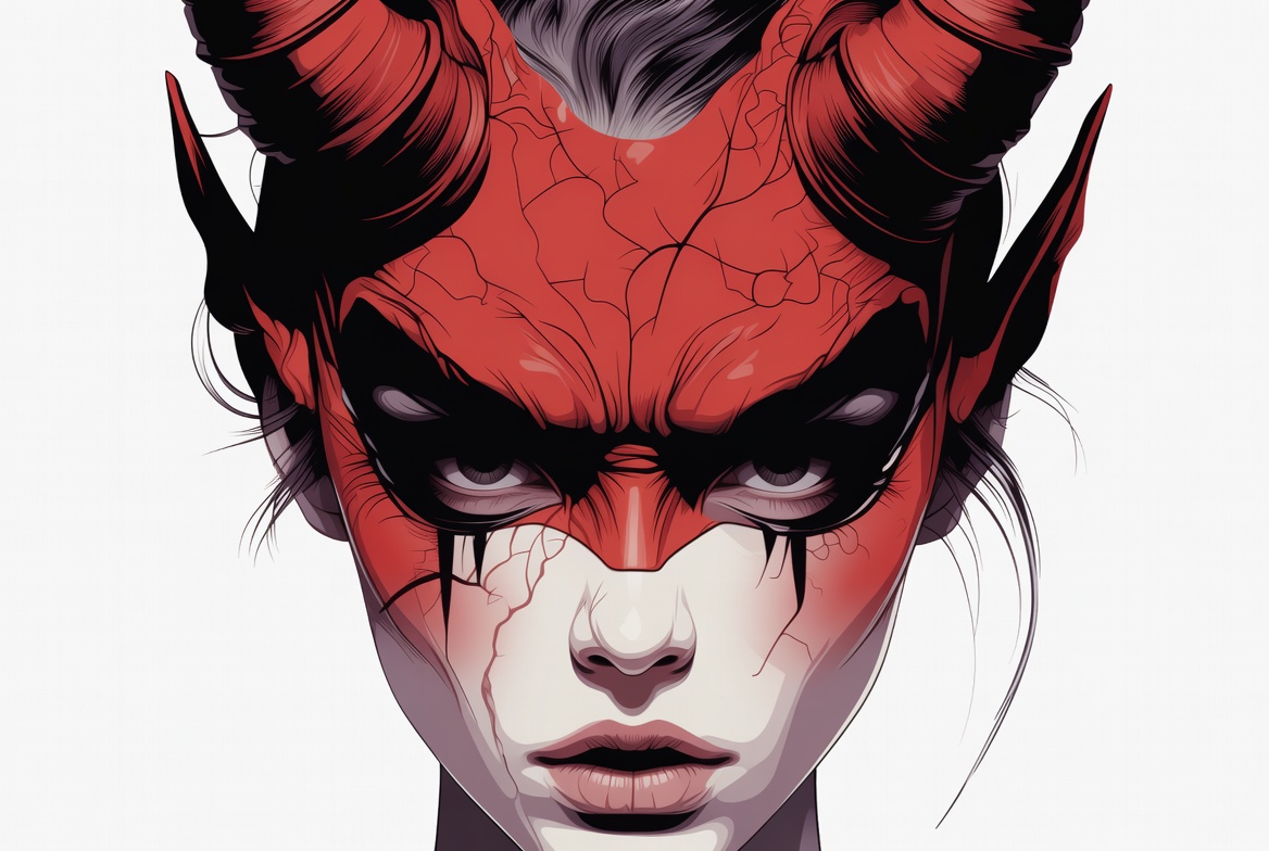 art style, character design, character features, close up, concept art, creative design, dark theme, detailed mask, dramatic look, eerie appearance, emotion, facial expression, fantasy, figure drawing, horns, modern art, red mask, striking face, unique mask, visual art