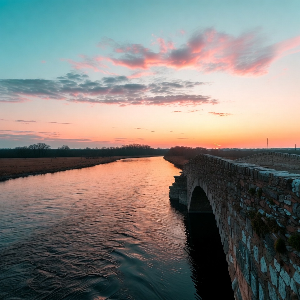 The sun sets over a river, reflecting warm colors on the water. A stone bridge spans the river in the foreground while fields stretch out.