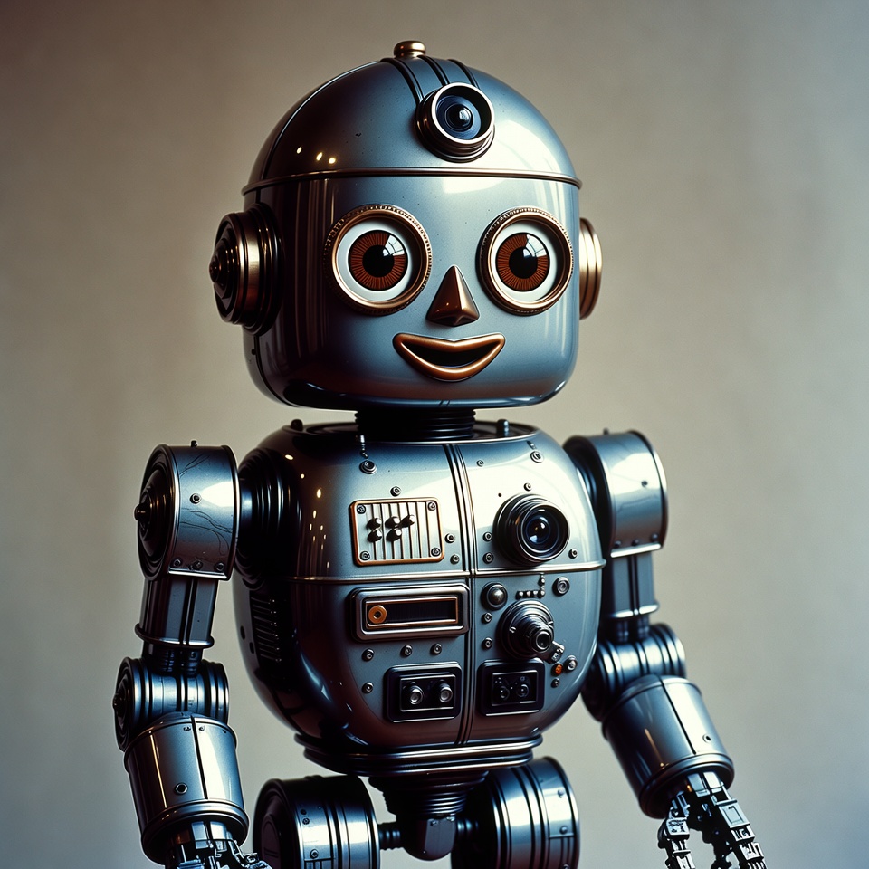 A robot with shiny metal parts and large eyes stands still in a simple setting. It has various small buttons and features on its body.