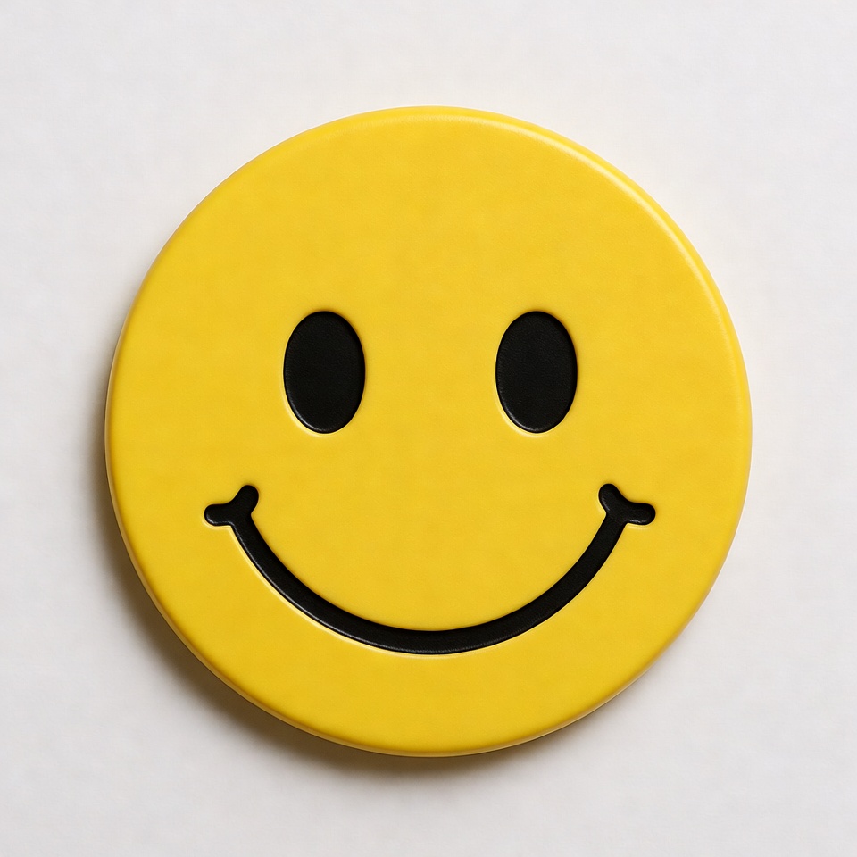 A round yellow smiley face with black eyes and a curved mouth is placed on a plain background. This design brings a cheerful vibe.
