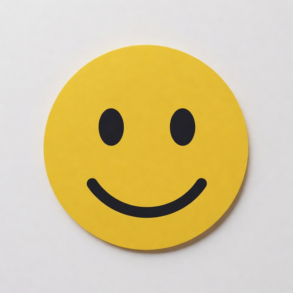 A round yellow smiley face with black eyes and a smiling mouth sits against a plain background. It brings a cheerful vibe to any space.