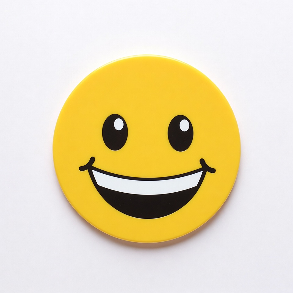 A bright yellow circle with a smiling face and big eyes is centered on a plain white background. It brings a cheerful vibe.