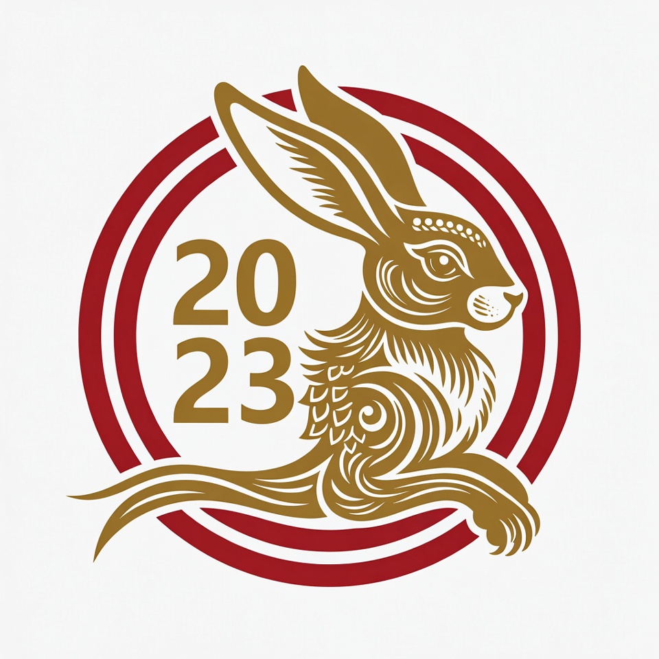 A rabbit sits within a circular design. The year 2023 is displayed, signifying the Lunar New Year celebration.