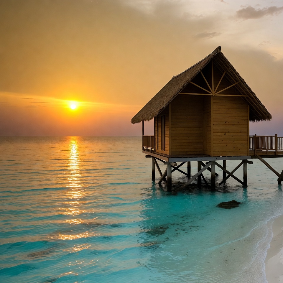 A wooden house sits on stilts by the water as the sun sets over the horizon, casting light on the waves and beach.