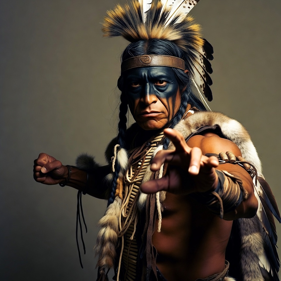 Indigenous man stands confidently in traditional clothing with feathers and paint, showing cultural pride and strength in close-up.