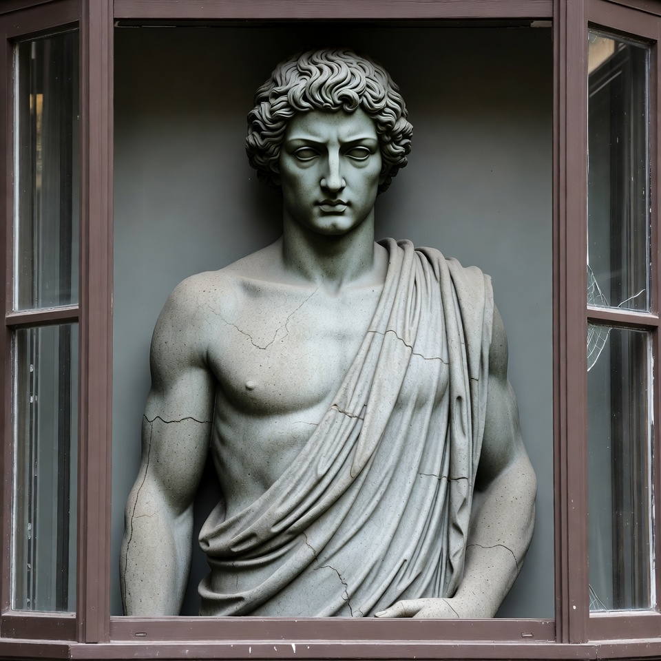 A muscular statue of a man stands in a window. The figure is dressed in draped clothing. The setting shows urban architecture around.