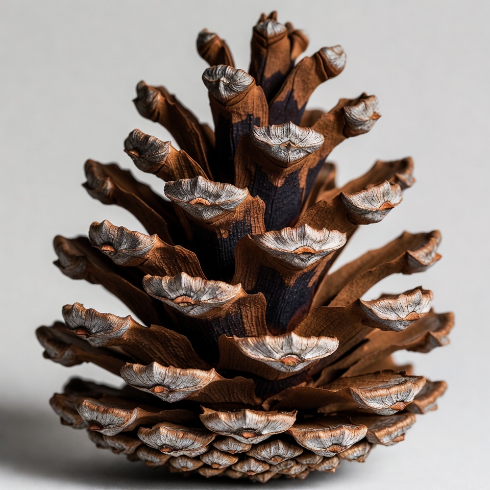 A pine cone resting on a flat surface, highlighting its structured scales and natural textures under soft light.