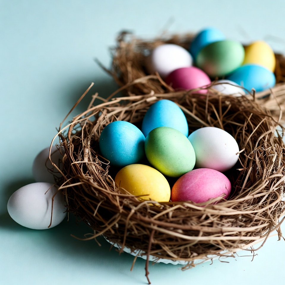 Two nests hold assorted eggs in bright colors. The nests are made of twigs and grass, creating a natural setting. Eggs are arranged randomly.