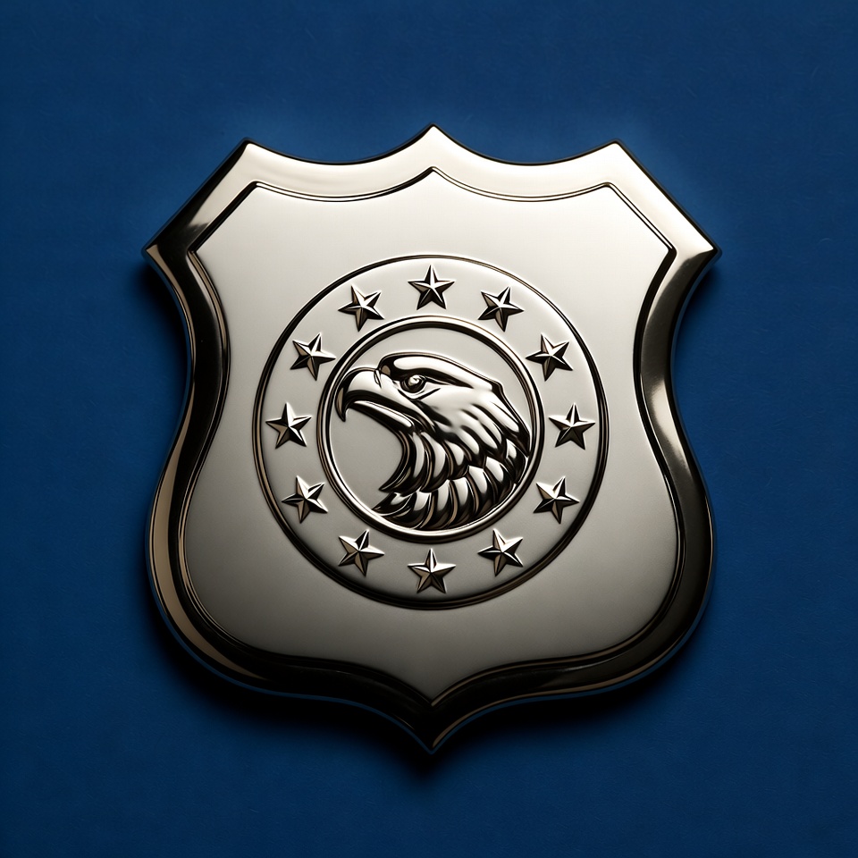 A silver police badge features an eagle design at the center. Stars surround the eagle on a blue surface, highlighting its details clearly.