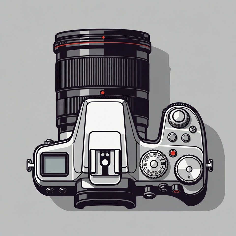 A camera sits on a plain gray surface. The lens is attached, and settings are visible. The focus is on the camera’s details.