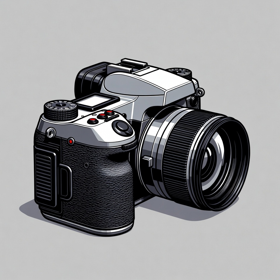 A camera with a large lens is resting on a gray surface. The design shows buttons and details on the body of the camera.