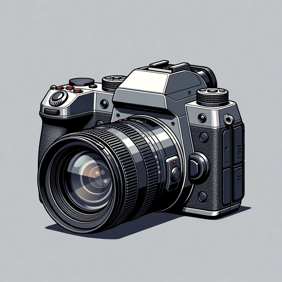 A camera with a detailed lens sits on a gray background. The camera is designed for capturing images with clear focus and depth.