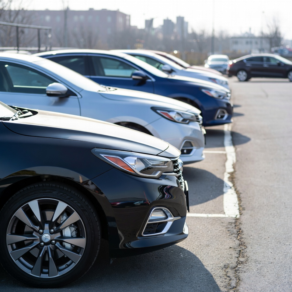 Cars parked in a lot under sunlight