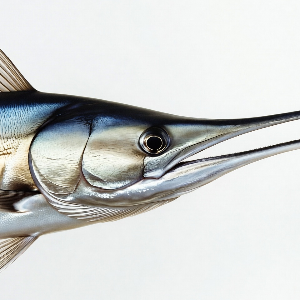 A fish swims in clear water. The fish has a streamlined body and pointed snout. Its scales reflect light.