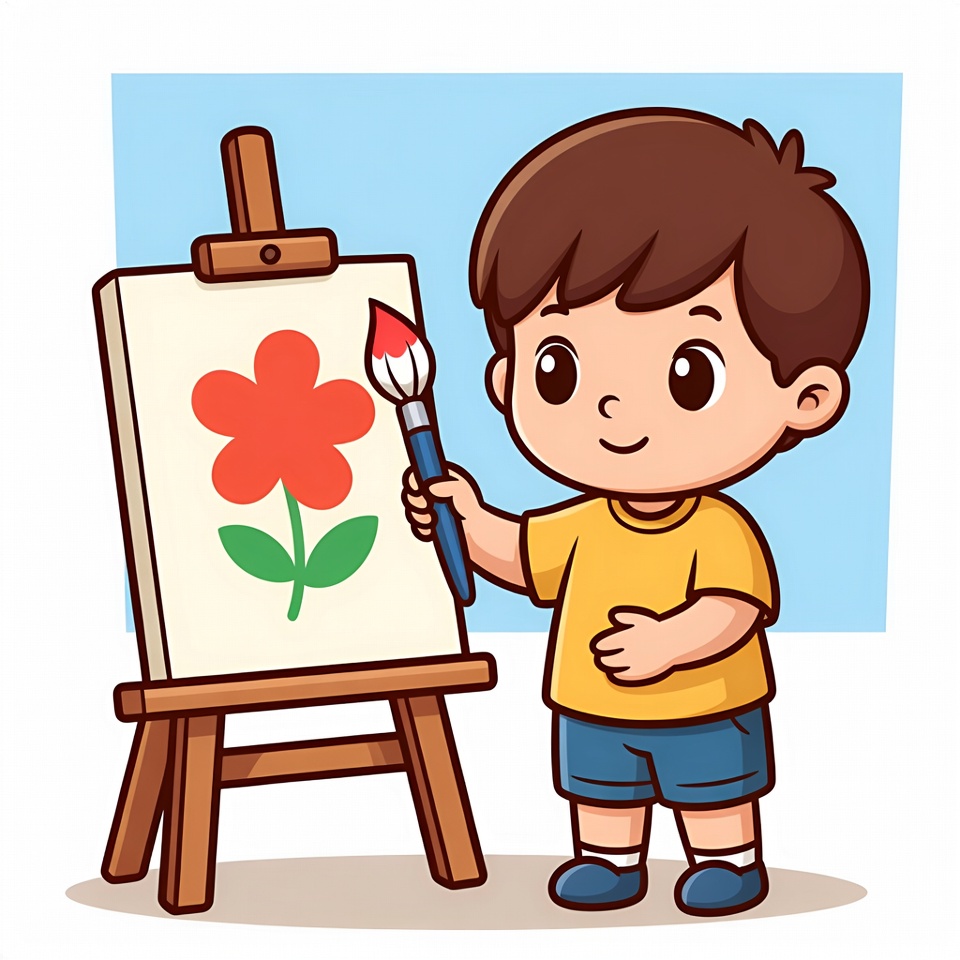 activity, art, boy, canvas, child, colors, creativity, daytime, easel, expression, flower, fun, green, learning, paintbrush, painting, play, preschool, red, young