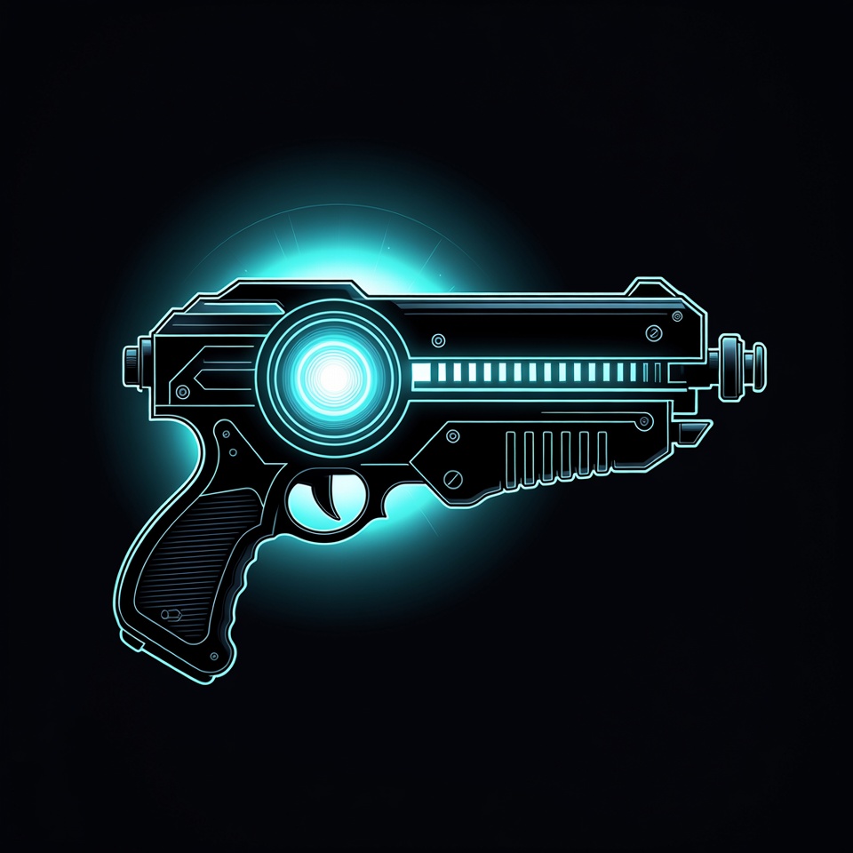 A futuristic gun with glowing parts is shown against a dark background. The design features a circle that emits light.