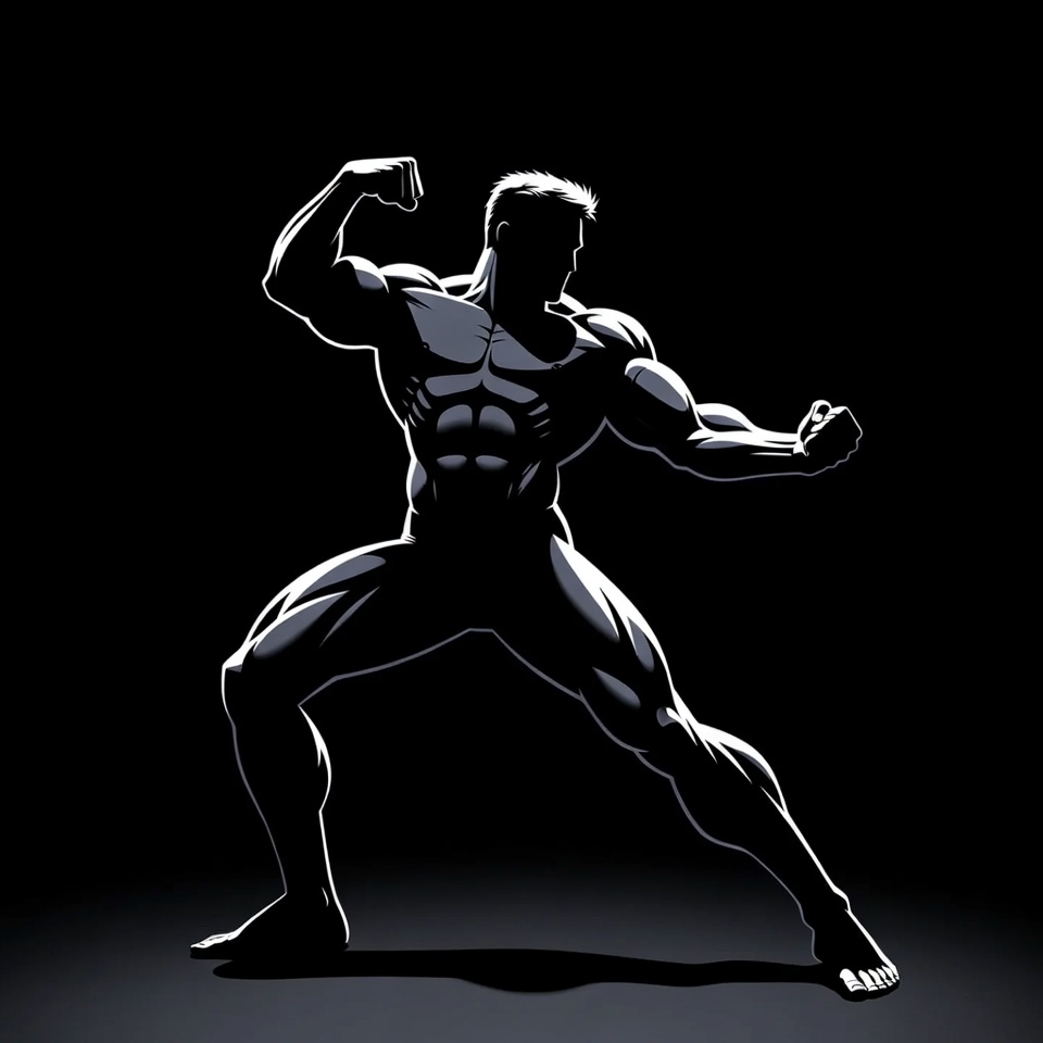 A muscular figure stands in a strong pose against a dark background. The focus is on the body shape and strength of the figure.