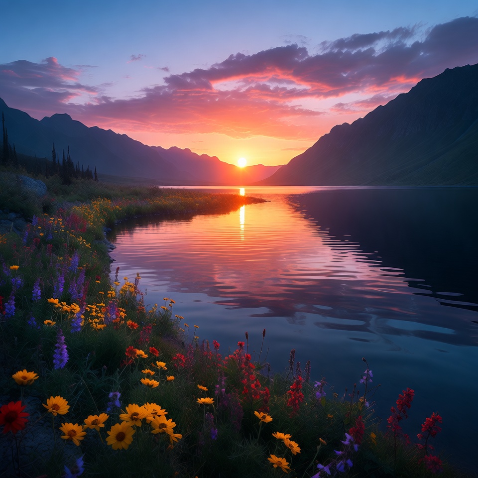 Sunset lights up the sky and water at a lake surrounded by mountains. Colorful flowers line the shore as day turns to night.