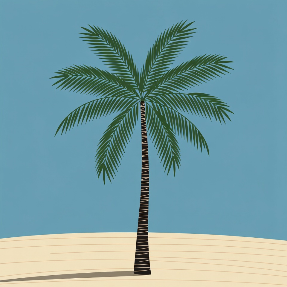 A palm tree stands tall on a sandy beach under a blue sky, with no people visible in the scene, highlighting nature's simple beauty.