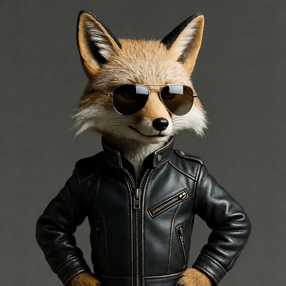 A fox wears sunglasses and a black jacket while standing in front of a gray background. The fox appears confident in the outfit.
